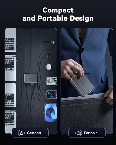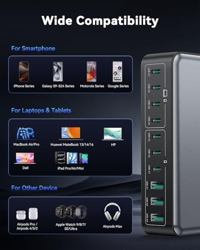 Widely Compatibility:This Rocoren GaN charger supports a maximum output power of 100W on the C1 and C3 ports, a maximum output power of 65W on the C2 and C4 ports and a maximum output power of 45W on the C5 port. The usb c charger station also supports most fast charging protocols such as PD3.0, QC4.0, QC3.0, QC2.0, AFC, FCP, PPS, etc. compatible with MacBook Pro 16″, 14″, 13″, MacBook Air, Dell XPS, compatible with iPhone 16,15 Pro/14 Pro Max/13/12, Samsung Galaxy S25 Plus/S24 Ultra/ S23 /S22, Moto G51/Razr 50 Ultra,OnePlus 13/Ace 3/5Pro,for iPad Pro, iPad Air Series AirPods Pro,for AppleWatch,Switch, Steam Deck and more
