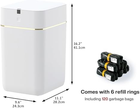 Self-seal the trash bag with one touchSelf-change to a new trash bagInstall the refill bag ring once and use for 20 timesLid opens in 0.15 s with Infrared motion sensorEasy to understand with voice promptsA single charge can last for 90 to 180 daysComes with 6-count refill bag rings (total 120 garbage bags)