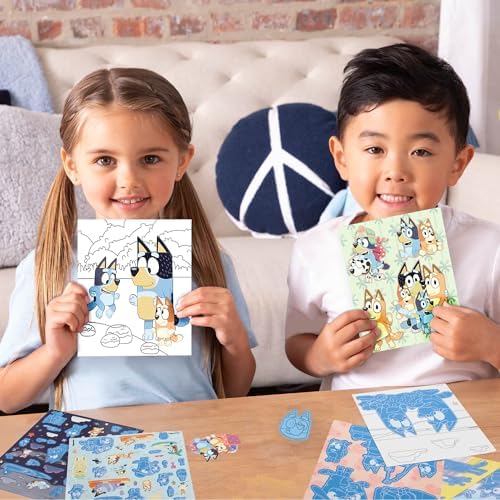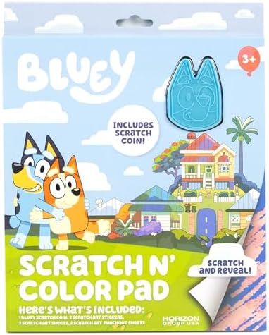 SET INCLUDES: 1 Bluey Scratching Coin, 1 Art Pad with 2 Sheets of Scratch Art Bluey Stickers, 5 Scratch Art Sheets & 2 Scratch Art Punch-Out Sheets (7 in. x 8 in.)