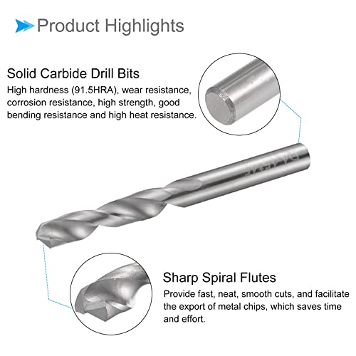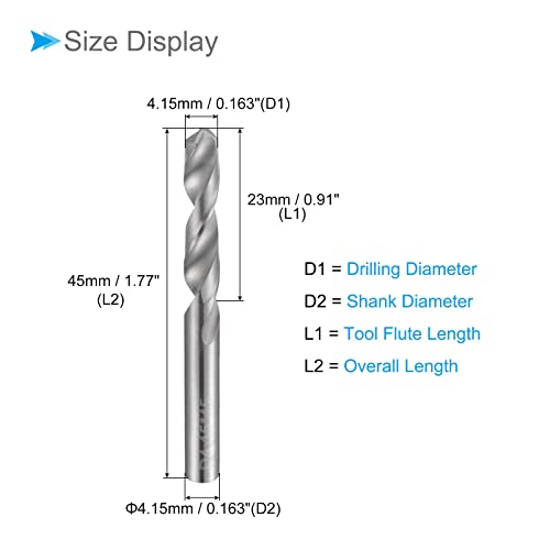 ★ Carbide Drill Bit Size — Drilling diameter: 4.15mm / 0.163″; tool flute length: 23mm / 0.91″; shank diameter: 4.15mm / 0.163″; overall length: 45mm / 1.77″; tool flute type: spiral; cutting hardness: up to HRC50; processing technology: fine grinding
