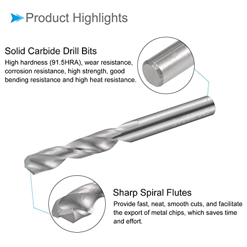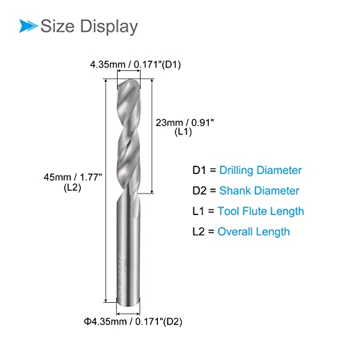 ★ Carbide Drill Bit Size — Drilling diameter: 4.35mm / 0.171″; tool flute length: 23mm / 0.91″; shank diameter: 4.35mm / 0.171″; overall length: 45mm / 1.77″; tool flute type: spiral; cutting hardness: up to HRC50; processing technology: fine grinding