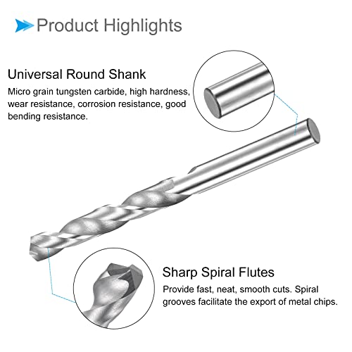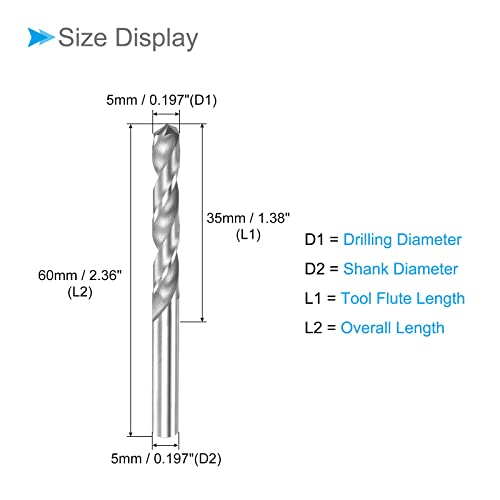 ★ Carbide Drill Bit Size — Drilling diameter: 5mm / 0.197″; tool flute length: 35mm / 1.38″; shank diameter: 5mm / 0.197″; overall length: 60mm / 2.36″; tool flute type: spiral; hardness: 91.5HRA; outer edge point angle: 120 degree