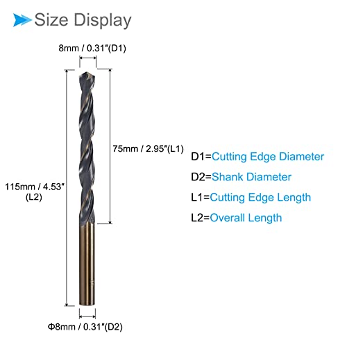 ★ Drill Bit Size — Cutting edge diameter: 8mm / 0.31″; shank diameter: 8mm / 0.31″; cutting edge length: 75mm / 2.95″; overall length: 115mm / 4.53″; shank type: round shank