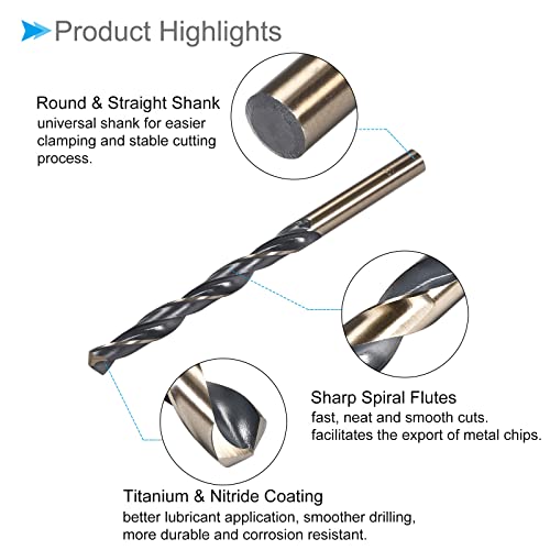 — The straight shank drill is made of 4341 high-speed steel, with high hardness, good toughness, high strength, and high wear resistance. The dual coating of gold titanium and black nitride provides better lubricant application, smoother drilling, and is more durable and corrosion resistant than regular black surfaces. Sharp spiral flutes provide fast, neat and smooth cuts. The spiral groove facilitates the export of metal chips, which saves time and effort in operation.