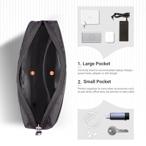 Versatile and Spacious: Offers ample space to securely store and organize essentials like your laptop charger, mouse, power bank, cables, pen drive, and more, while also suitable as a toiletry, cosmetic, or travel organizer pouch.