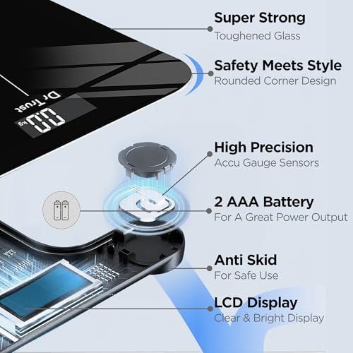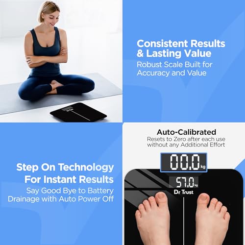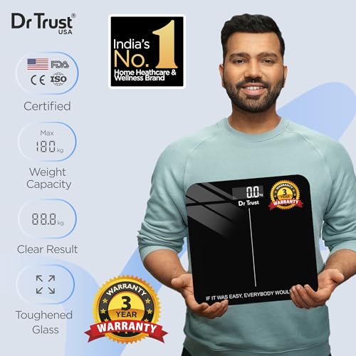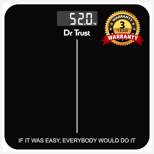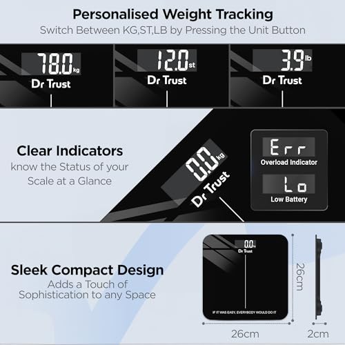 Dr Trust Inspire Personal Weighing Scale is a digital scale that helps you track your weight accurately. It gives you accurate weight measurements of up to 180 kg. It comes with an auto-calibration feature for initial use. You need to step on the scale and step off immediately so that the scale gets calibrated. It also has highly précised G- sensors for more accuracy. Scale is compact and fits in a small corner or space of your room. It starts automatically when you step on the scale. Also, it turns off automatically when not in use. It is powered by 2 X AAA batteries for long time use. Made up of high-quality tempered glass which is extremely sturdy. It comes with anti-skid padding and rounded corners to keep the weighing platform safe while taking measurements. The product features an easy-to-read large LCD display that shows clear weight measurements with battery drainage.Note: Not Legal for Trade (Transactions / Protection) Product intended for personal use only.