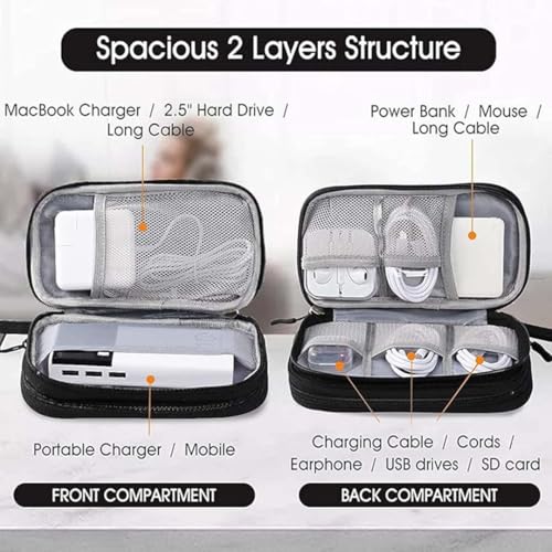 Double Layer Design: Features two organized compartments with mesh pockets and elastic straps to securely store cables, chargers, earphones, USB drives, Mobile phones, power banks and other essential accessories.
