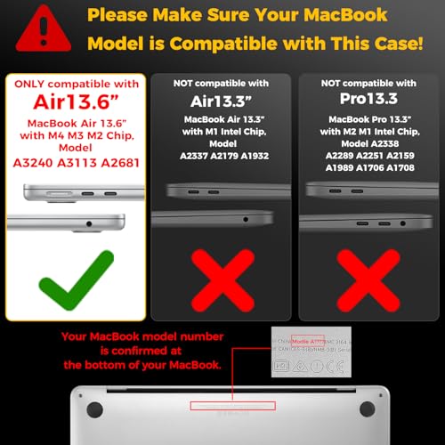 ✔️Only Compatible for MacBook Air 13.6 inch M4 M3 M2, 2025 2024 2022 Release, Model&Chip: A3240(M4) A3113(M3) A2681(M2) ✔️Please check the mac laptop model “AXXXX” on the back before purchasing ✔️Please note that due to differences in size and interface layout among different laptop models, this protective case is not suitable for other mac models