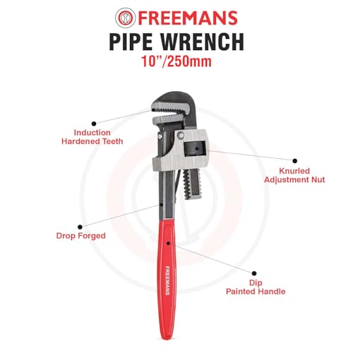 FREEMANS high-quality Stillson Type Pipe Wrench is manufactured with selected high grade Alloy Steel. It is drop forged to withstand the toughest jobsite conditions. It features induction hardened teeth to perform tightening and loosening tasks with ease. Opening size is mentioned on moveable Jaw for convenience of user. DIP PAINTED HANDLE to resist corrosion, and maximise working life of the Pipe Wrench