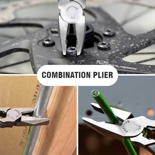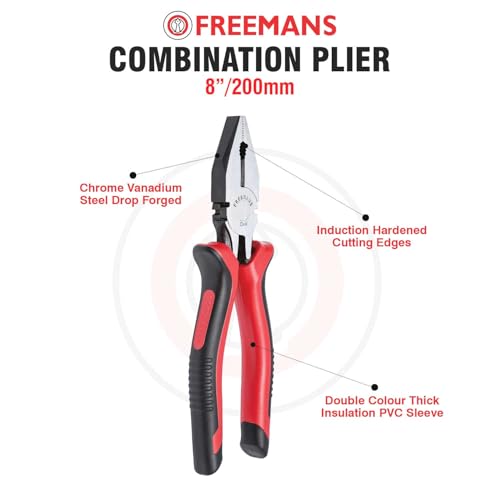 The FREEMANS combination plier has cellulose acetate sleeve for gripping, holding, and cutting wires. They are made with drop-forged, heat-treated chrome vanadium steel (CR-V) with a sharp, laser-hardened cutting edge and strong gripper teeth. It has a thick insulation PVC sleeve. Which is non-slip grip and comfortable suitable for long-term use