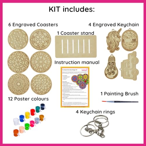 Creative Craft Kit: This wooden mandala painting set includes 6 pre-marked coaster blanks, 4 keychain blanks, poster paints, a brush and instructions for fun DIY mandala art.
