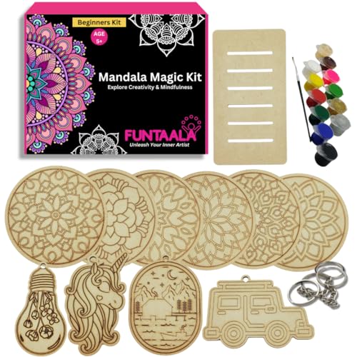 Funtaala Mandala Magic Kit – Beginners Kit for Creativity & Mindfulness | Includes Wooden Coasters, Keychains, Poster Colors, Brush & Instruction Manual