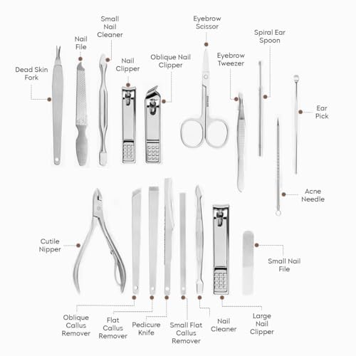 {𝟏𝟖 𝐏𝐑𝐎𝐅𝐄𝐒𝐒𝐈𝐎𝐍𝐀𝐋 𝐓𝐎𝐎𝐋𝐒 𝐅𝐎𝐑 𝐂𝐎𝐌𝐏𝐋𝐄𝐓𝐄 𝐍𝐀𝐈𝐋 𝐀𝐍𝐃 𝐒𝐊𝐈𝐍 𝐂𝐀𝐑𝐄} : This Gleva Manicure Kit includes a wide array of tools designed for precise grooming, such as a Cuticle Nipper, Eyebrow Scissor, Eyebrow Tweezers, Flat Callus Remover, Oblique Callus Remover, Ear Pick, Small Nail File, Nail File, Nail Cleaner, Small Nail Cleaner, Acne Needles, Double-Ended Acne Needles, Spiral Ear Spoon, Straight Pedicure Knife, Large Nail Clipper, Small Nail Clipper, Diagonal Nail Clipper, and Dead Skin Fork. These tools offer complete care for nails, skin, and more, ensuring professional-level grooming at home or on the go.
