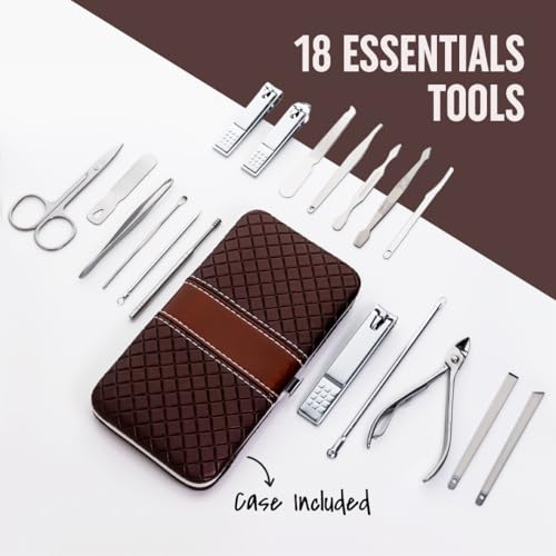 {𝐒𝐓𝐘𝐋𝐈𝐒𝐇 𝐀𝐍𝐃 𝐂𝐎𝐌𝐏𝐀𝐂𝐓 𝐋𝐄𝐀𝐓𝐇𝐄𝐑 𝐓𝐑𝐀𝐕𝐄𝐋 𝐂𝐀𝐒𝐄} : The sleek leather travel case not only adds a touch of luxury but also keeps all 18 pieces securely organized. Its compact design allows for easy storage and portability, making it perfect for travel or keeping in your bathroom cabinet. Whether for personal use or as a gift, this stylish case ensures that your grooming tools are always ready and easy to access.
