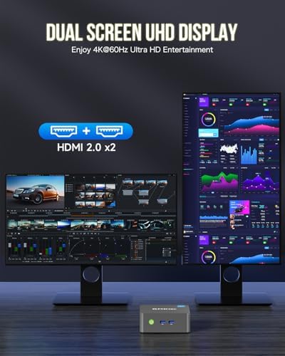 4K DUAL SCREEN DISPLAY – Mini desktop computer is equipped with upgraded Intel Graphics(max 1000MHz), supports 4K video playback and AV1 decoding, connect the pc with a projector as a home theatre, enjoy a variety of entertainments. Two HDMI 2.0 ports allows you to multi-task efficiently on two 4K@60Hz displays