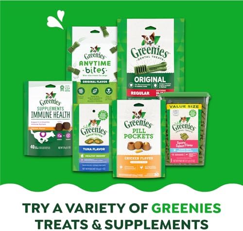 One GREENIES Original Dental Treat a day is all it takes for clean teeth, fresh breath, and a happy dog. Your dog can’t wait to sink their teeth into these delicious, original-flavor dental dog breath chews because they feature a delightfully chewy texture that fights plaque and tartar. Irresistibly tasty and incredibly powerful, GREENIES Treats for Dogs are vet-recommended for at-home oral health care and accepted by the VOHC (Veterinary Oral Health Council.) Best of all, these natural dog breath treats are made with highly soluble ingredients that are safe and easy to digest. Give your dog the mouth-wowing treat that helps promote their overall health with GREENIES Dog Treats. Great for small breeds and little dogs between 5 and 15 lbs. Natural Dog Treats Plus Vitamins, Minerals, and Other Nutrients.