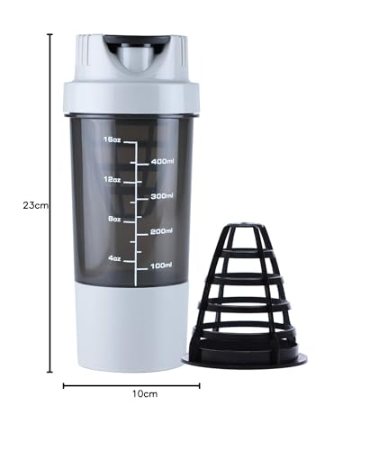 LARGE CAPACITY: 500 ml protein shaker bottle, perfect for fitness enthusiasts.WIDE MOUTH: Wide mouth makes it easy to add mix scoops and liquids.STRONG: We have used strong and durable plastic for longer product life.SAFE PLASTIC: Made from BPA and Phthalate free plastic for safer use.HIGHLY DURABLE: Microwave, dishwasher & freezer safe container.
