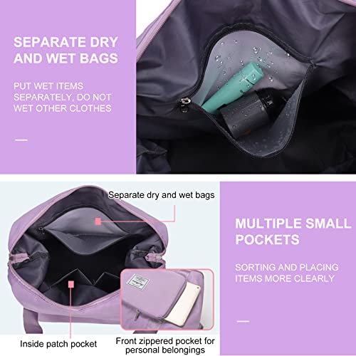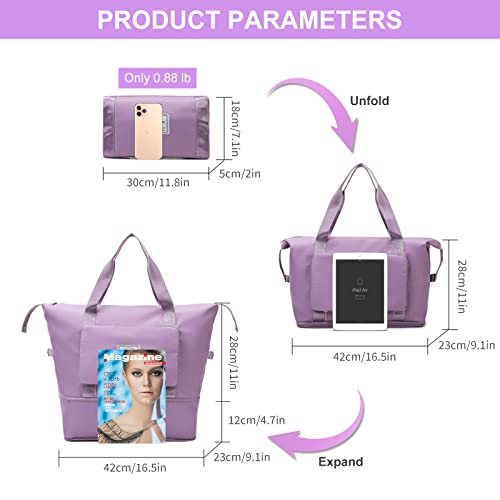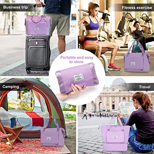 Large Capacity Folding Travel Tote Bag, Oxford Fabric Waterproof Lightweight Foldable Travel Duffel Bag, Portable Expandable Travel Bag, Dry and Wet Separation Carry On Bag for Airplanes, Purple