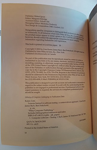 Decades of software testing experience condensed into the most important lessons learned. The world’s leading software testing experts lend you their wisdom and years of experience to help you avoid the most common mistakes in testing software. Each lesson is an assertion related to software testing, followed by an explanation or example that shows you the how, when, and why of the testing lesson. More than just tips, tricks, and pitfalls to avoid, Lessons Learned in Software Testing speeds you through the critical testing phase of the software development project without the extensive trial and error it normally takes to do so. The ultimate resource for software testers and developers at every level of expertise, this guidebook features: * Over 200 lessons gleaned from over 30 years of combined testing experience * Tips, tricks, and common pitfalls to avoid by simply reading the book rather than finding out the hard way * Lessons for all key topic areas, including test design, test management, testing strategies, and bug reporting * Explanations and examples of each testing trouble spot help illustrate each lesson’s assertion