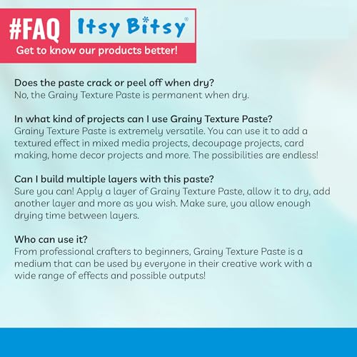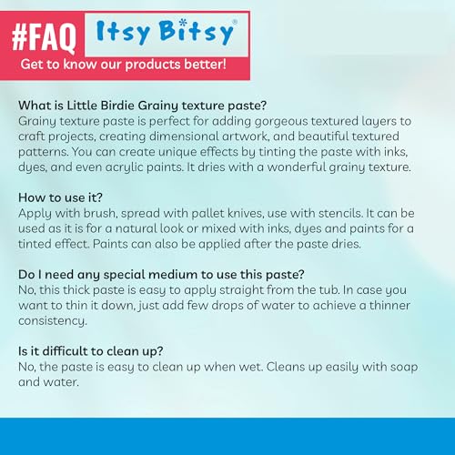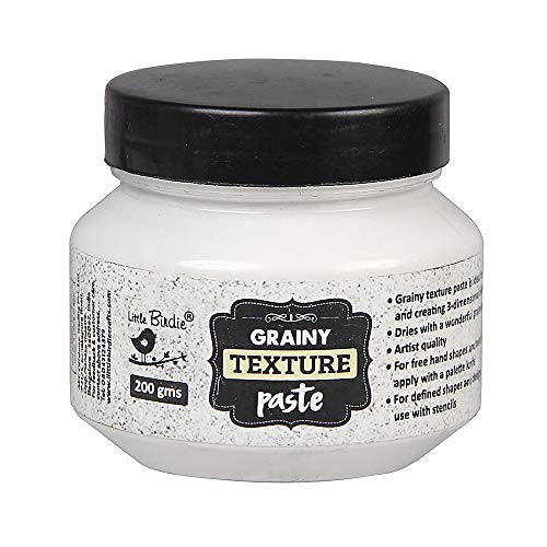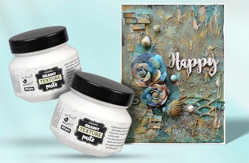 Grainy texture paste is ideal for layering and creating 3-Dimensional effects For defined shapes and designs, use with stencils For free hand shapes and textures, apply with a palette knife. Tintable with inks when wet. When dry, the surface is paintable with acrylic paints, inks and other mediums. Clean up with soap and water when wet. Dries with a wonderful grainy texture.