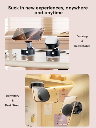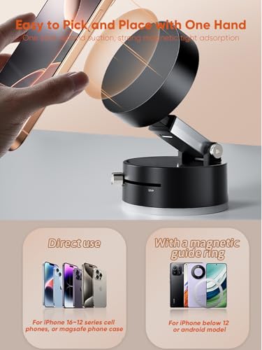 Anywhere, Anytime Experience the freedom of hands-free convenience with our suction bracket. Suction cup‘s designed allows you to adsorb it to any smooth surface, free your hands and enjoy a new level of convenience. Compatible with iPhone 16/15/14/13/12 Series and MagSafe cases, NOTICE:( iphone below 12 or Android models need to be used with a magnetic guider ring; Non-smooth wooden surfaces cannot be used )