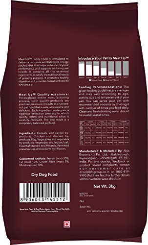 From the given chart you can start introducing Meat Up Puppy dog food by 10% proportionately with the current food. Gradually you need to increase the amount so that by a week you can give Meat Up Puppy food to your pet. Clean and fresh water should be available at all the times.
