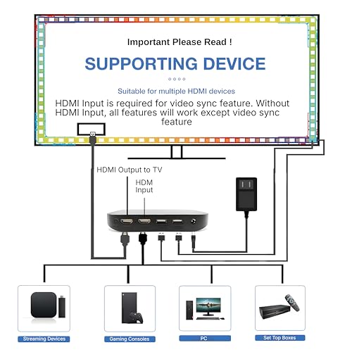 IMPORTANT PLEASE READ – HDMI Device Required: You must connect a HDMI device for lights syncing. Apps on your Smart TV are not synced with lights, only the apps & streaming services on your HDMI device ( Compatible with Firestick, set top box, gaming consoles ) can be synced.