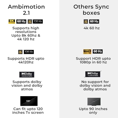 Fantasia Technology: Wireless Sync technology to sync multiple light options like Light Bars, Floor Lamps, Ceiling Lights, wall lights with your Ambimotion Sync Box which accurately coordinates with the content being played on your screen.