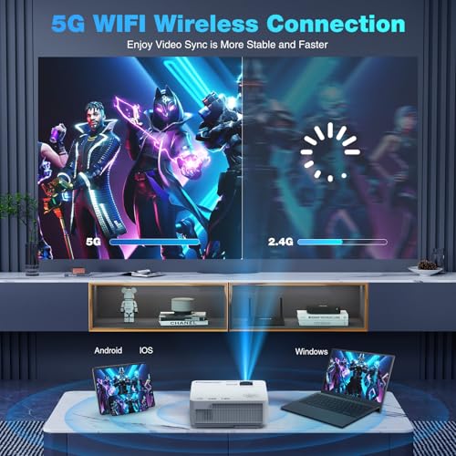 ๐***Latest 5G WIFI with Portable Tripod***With latest WiFi connection technology, this WIFI projector enables Android/IOS/Laptop device to synchronize screen mirroring by both 2.4G and 5G WiFi, Ultra-fast 5G WiFi offer you a much smoother, stable, and lag-free online videos/Gaming/Microsoft APP playing experience. (Copyright videos like Prime Video and more need to be connected to a TV stick (not included) or HDMI cable to watch)