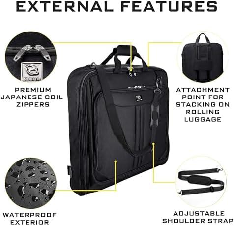 HYBRID SOFT-BODY GARMENT BAG WITH SEMIRIGID STRUCTURE PIPING: Zegur’s over-shoulder clothing carrier offers stress-free protection for your business trip, wedding, or weekend getaway. Multiple interior zipper pockets hold everything from suits and dresses to shoes and ties. A spacious exterior pocket provides easy access to electronics and documents