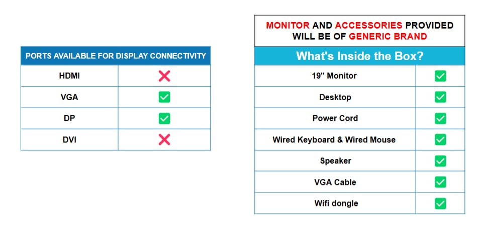 Box Contains: 19″ HD LED Monitor, Keyboard & Mouse, Wifi dongle, Speakers, Power cable Note : Monitor provided will be of any compatible brand & Accessories provided would be of compatible brands.