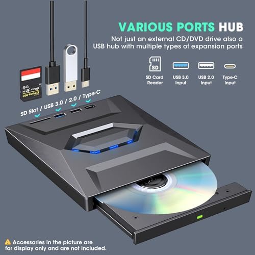 【Integrated Multi-types of Ports】This external disk drive is not only a CD and DVD reader writer, but also serves as a multi-hub featuring USB 3.0 port, USB 2.0 port, USB Type-C port, and SD card slot, so that you can effortlessly connect additional computer external components like a USB hard drive, wired mouse, keyboard, or flash drive, facilitating the seamless transfer of camera photos and videos from the card to your PC. Simplify your desktop setup with just one drive. (Note: Accessories shown in the picture are for functional display purposes only and are not included.)