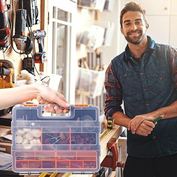 The double side toolbox is suitable for storing various parts, fasteners, screws, nuts, bolts, electrical connectors, hair accessories, beads, fishing tackles and various other smaller construction items.