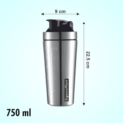 Material Description: Dimension : 9cm x 9cm x 22.5cm| Capacity : 750ml | The Signoraware Shaker Crafted from premium stainless steel, the Signoraware Protein Shaker bottle offers durability and resistance to rust or corrosion. The high-quality material ensures long-lasting performance, making it a reliable choice for your fitness needs. The steel also ensures that your drinks stay fresh and free from any unwanted flavors or odors.