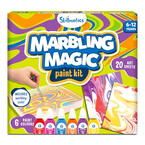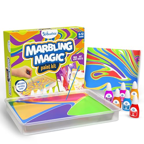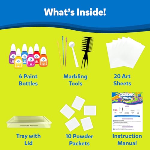 INCLUDES: 6 Paint Colours, 20 Art Sheets, 1 Tray with Lid, 10 Carrageenan Powder Packets, Marbling Tools, and an Instruction Manual.
