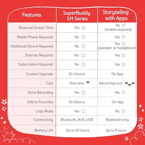 𝟭𝟬𝟬% 𝗦𝗰𝗿𝗲𝗲𝗻-𝗙𝗿𝗲𝗲: SuperBuddy provides a zero-screen experience, reducing children’s exposure to excessive screen time. No apps, no screens—just pure fun and learning through a curated selection of stories, songs, and rhymes. SuperBuddy helps parents achieve the right balance between beneficial screen time and screen-free play, fostering healthy digital habits while protecting kids from screen addiction.