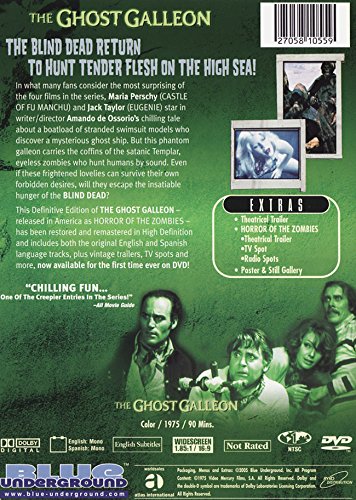 THE BLIND DEAD RETURN TO HUNT TENDER FLESH ON THE HIGH SEA! In what many fans consider the most surprising of the four films in the series, Maria Perschy (CASTLE OF FU MANCHU) and Jack Taylor (EUGENIE) star in writer/director Amando de Ossorio’s chilling tale about a boatload of stranded swimsuit models who discover a mysterious ghost ship. But this phantom galleon carries the coffins of the satanic Templar, eyeless zombies who hunt humans by sound. Even if these frightened lovelies can survive their own forbidden desires, will they escape the insatiable hunger of the BLIND DEAD