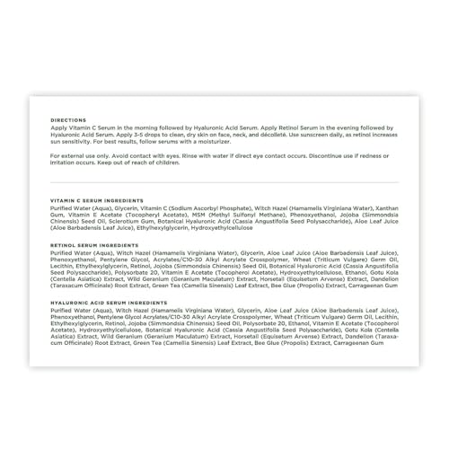 POWERFUL ANTI-AGING TRIO: This set includes our beloved Vitamin C Serum to brighten and even skin tone, Retinol Serum to reduce fine lines and wrinkles, and Hyaluronic Acid Serum for deep hydration. Used together, these potent serums visibly improve skin texture, tone, and firmness for a more youthful complexion. Suitable for all skin types including sensitive skin. See noticeable results in as little as 2-4 weeks with consistent use.