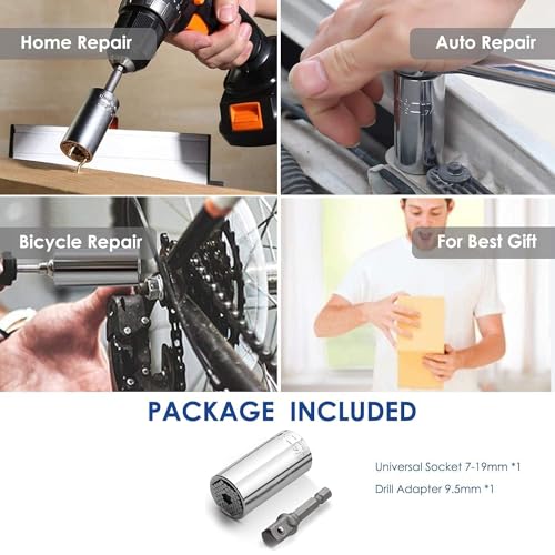 Clever and Useful Tools Ever: Universal socket grip is equipped with power drill adapter, easy connect with most electric drills, electric screwdrivers and manual ratchet set. The brilliant universal socket instantly adjust to grip most metric, wing nuts, broken nuts, stripped nuts, eye bolts, square nuts, hexes and most irregular shape. This magic socket is must have all in one tool for both the professional and the average person. Great addition to your toolbox, cool gift for men and family