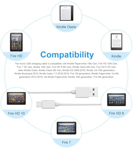 Compatible: Micro USB charging cable compatible with Kindle Paperwhite 10th Generation, Fire HD 10 7th Generation, Fire 7 7th Generation, Kindle 10th Generation, Fire HD 8 8th Generation, Kindle Oasis 9th Generation, Fire HD 8 7th Generation, Old Kindle Oasis, Kindle Oasis 9th Generation, Kindle DX 2009-2010, Kindle Generation 1-10, Kindle Keyboard 2010, Kindle Oasis 1-3 2016-2019, Fire 7th Generation, Kindle Paperwhite Gen 1-4 2012-2018, Old Kindle Paperwhite, Kindle 10th Generation, Fire 8th Generation